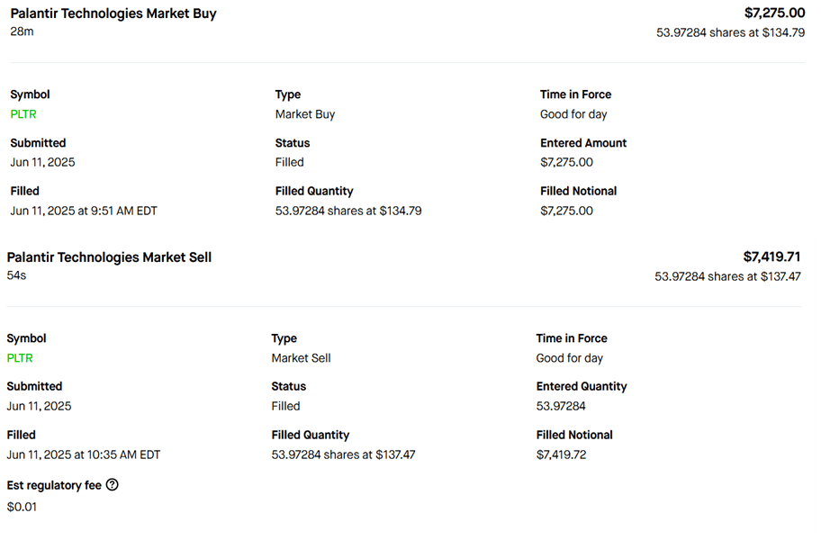 My original target was TSLA (stay flexible). PLTR was making a good move above tge 9EMA on the 15 & 5 minute. Got an OK entry. Fell right after (don't panic sell). Then it turned and never looked back. Started a new exit strategy, once I hit my 1% goal, I am watching the 1 minute for strength in movement. At 10am, it appeared to be losing momentum. Good solid gain. Kept going after my exit. Now above 138.