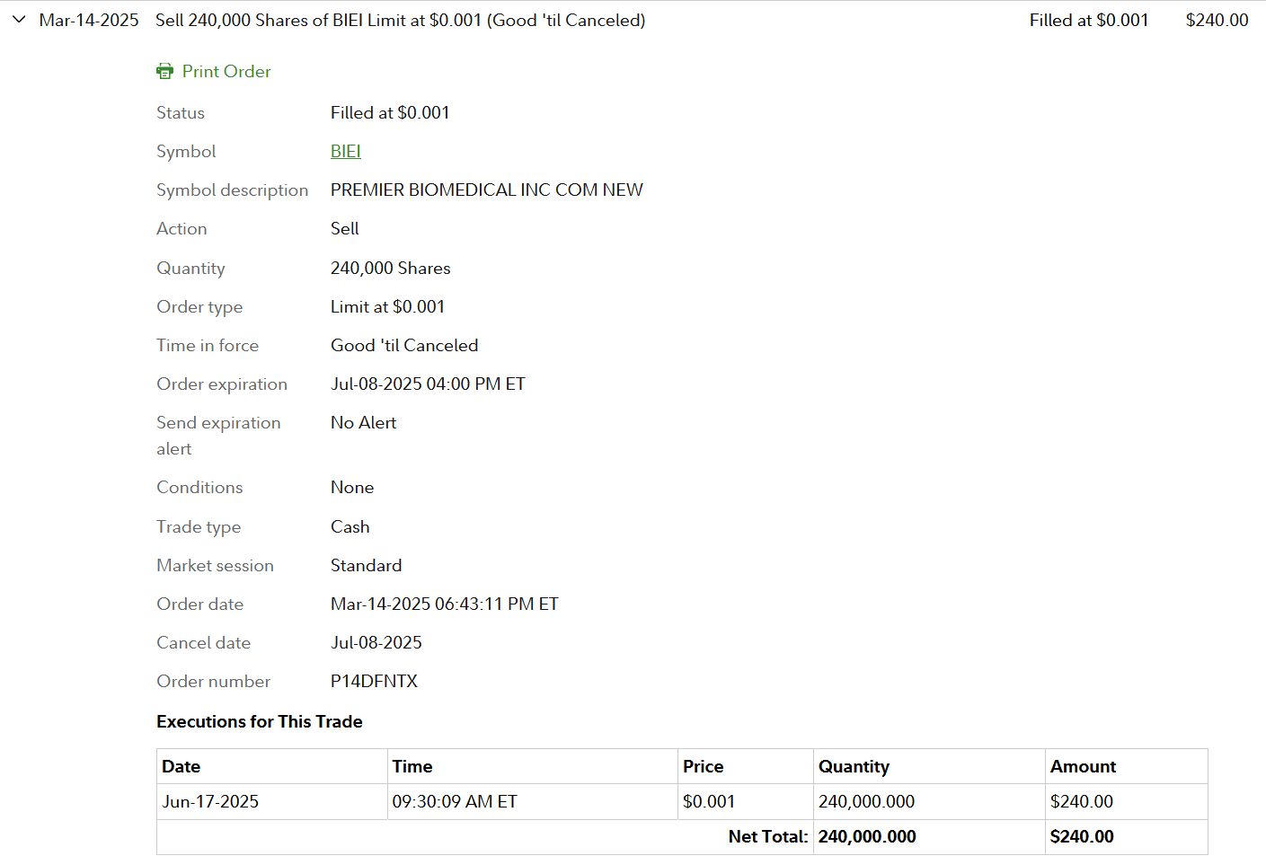 I got in this trade because it was a 5-time former runner since 1/6/21 on its fourth red day off of 9/12/24-9/17/24 $0.0019 HOD. Dip bought 10:00 $0.0012 120k at general support area on the 3-month daily. Price fell so added 2/19/25 $0.0006 120k. I set my Limit Sell at $0.001 & moved on. Fidelity got me out on the PR spike to $0.0012 at the open 6/17/25 8:30 $0.001. Former runners can run again.