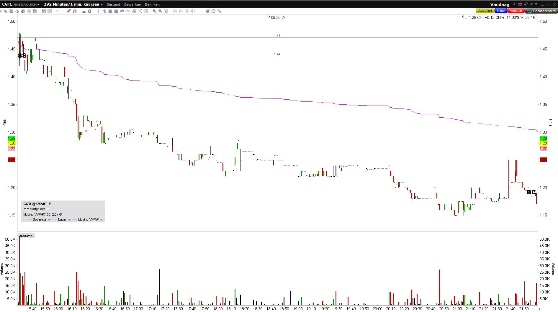 ENTRY: SRD, gister down ong -36%, doet nu genoeg volume maar heb moeite met instappen door SSR. Kom er niet in voor de open maar heb dit keer geluk met een bounce en short op 1.44. Open was 1.47 maar wou entry niet missen dus zette lager in. Kon max 7500 shares shorten maar was prima rond 11k usd size. Had 12,5k geshort als het kon want ben sinds vandaag upgesized. EXIT: cover 1.19 bij close. LES: Prima trade en blij dat ik er nog in kon komen. 17% gain en met MITQ totaal 2,5K dag!