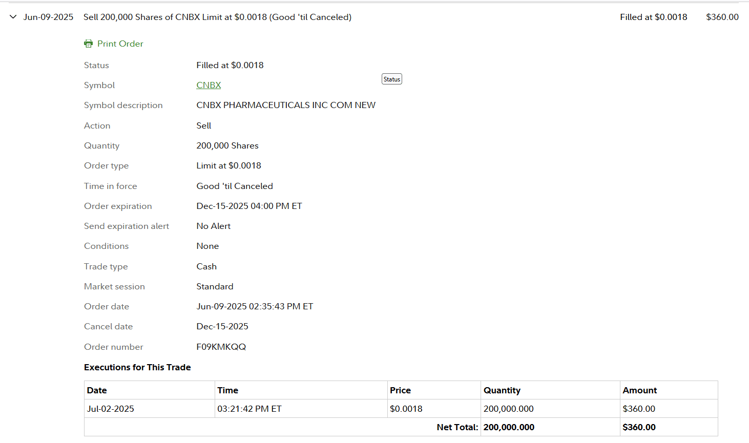 I got in this trade because it had spiked to OTC #1 Biggest % Gainer but LOW volume but willing to give it a try. Rare front side (for me) dip bought 5/21 13:06 $0.0016 100k 30% off 9:41 $0.0023 HOD. Price slowly trailed away not getting above $0.0017. Added 6/9 11:12 $0.001 100k, immediately set my Limit Sell for $0.0018 $100 profit, and moved on. Fidelity got me out 14:21 on the volume surge 7/2 14:13 $0.0009 to 14:29 $0.0063! Missed a $1k profit argh!