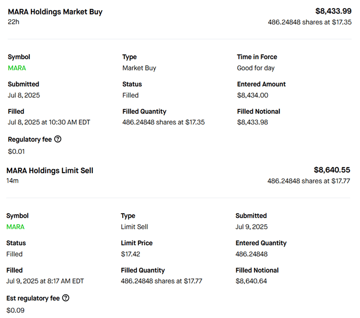 Patience. There were several opportunities in the morning. I bounced between a few choices. MARA ended up fitting my set up. Got a decent entry and it went sideways all day. Since I am on vacation, I couldn't keep an eye on it. It closed at my goal. After a night of family and frolic, woke up to a great upper momentum. After it hit above a $200 profit, I hopped out. Good solid trade!