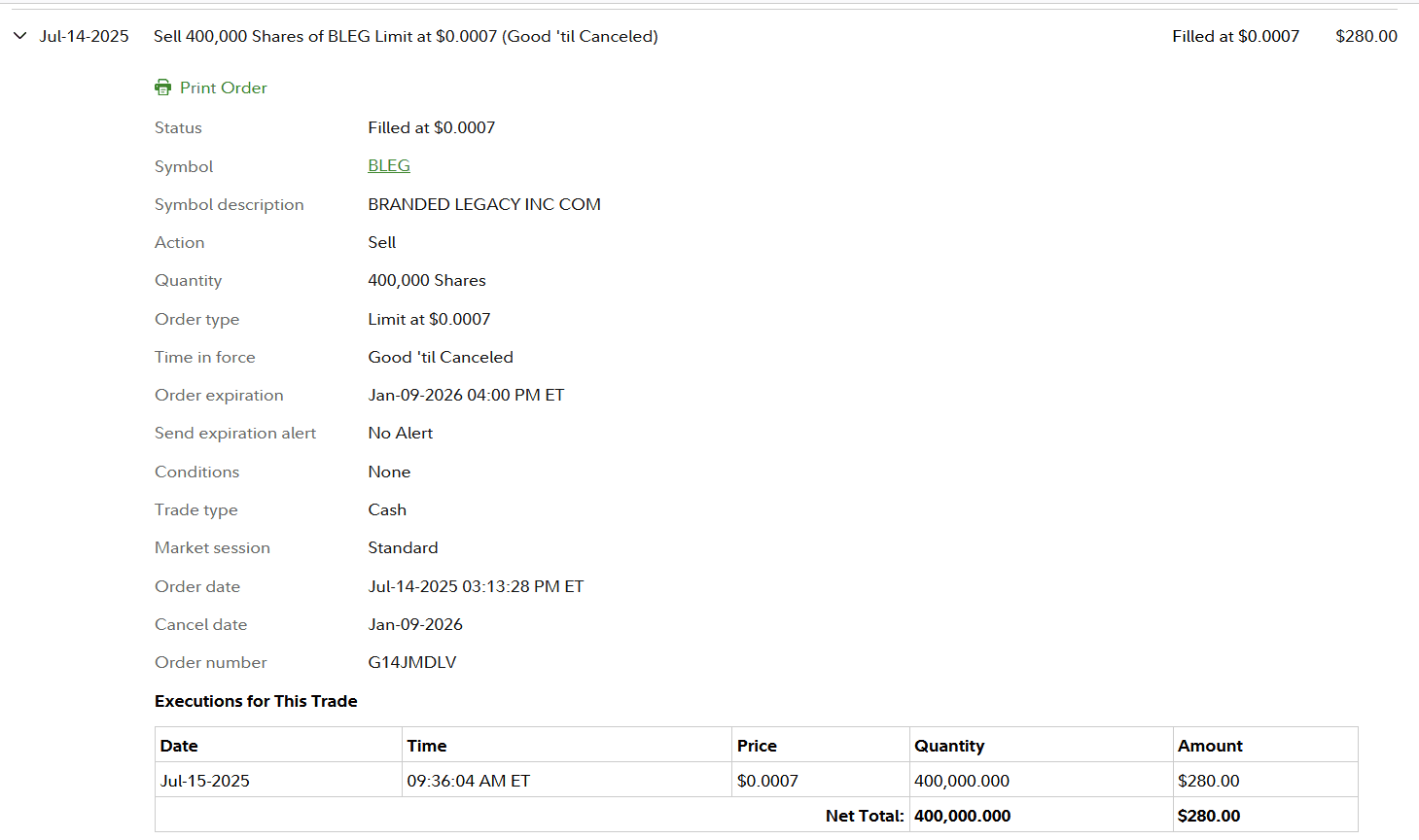 I got in this trade because it had spiked to OTC #2 Biggest % Gainers with Volume on PR. Rare [for me] front side dip bought 7/14 14:12 $0.0006 [at VWAP] 25% off 13:03 $0.0008 HOD. I immediately set my Limit Sell at $0.0007 for the single and Fidelity got me out 7/15 8:36.