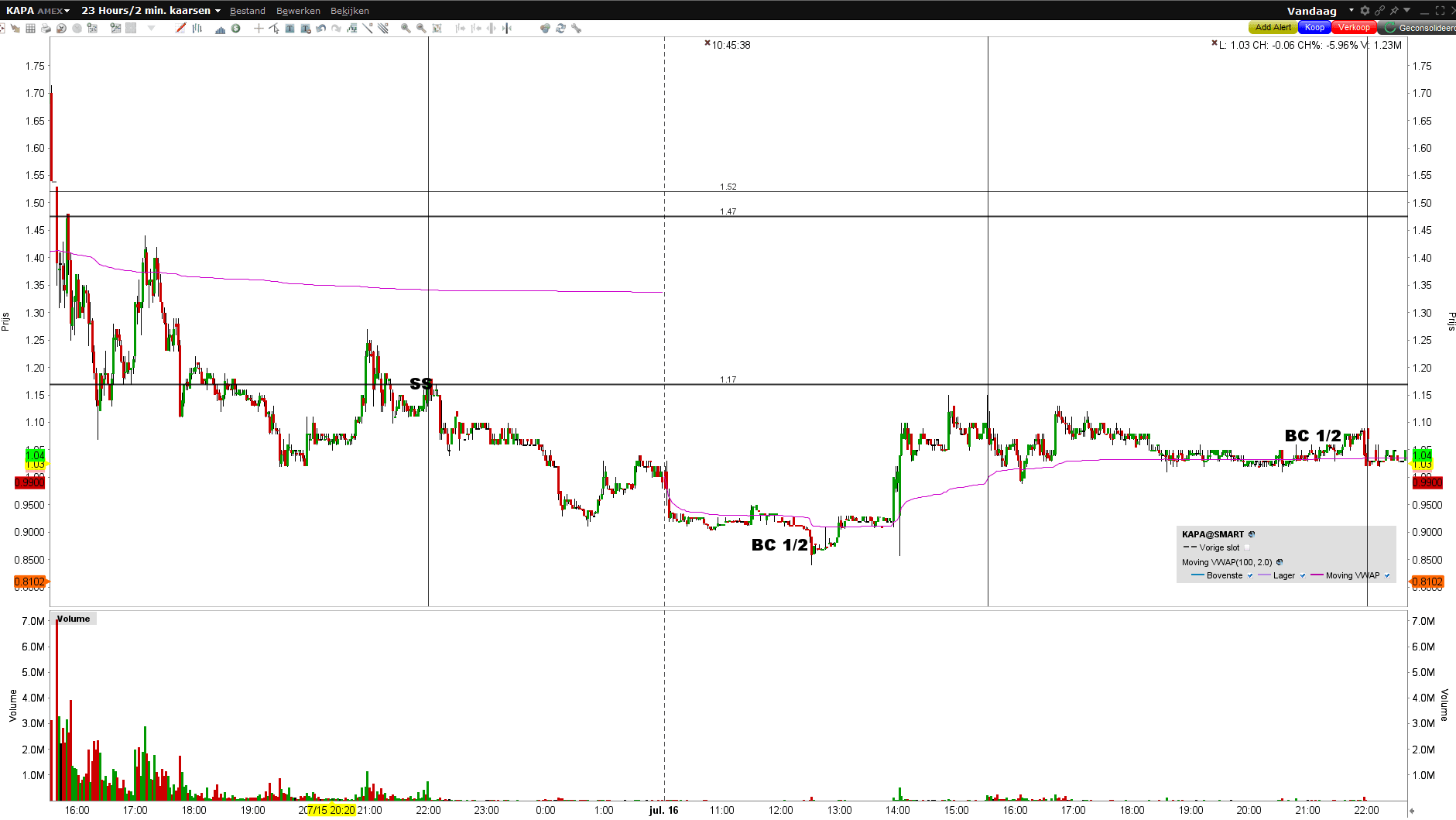 ENTRY: DD1, up ong 70%, prima setup alleen wat chinese investors dus uitkijken. Ik short 1.17, precies close. EXIT: In PM net als met SONN -25% al heel vroeg dus ik besluit half te coveren op 0.877. Andere helft eraf gehaald bij close op 1.08. LES: Blij dat ik helft eraf had gehaald in PM. Eindelijk pakt een discretionary besluit van mij goed uit.