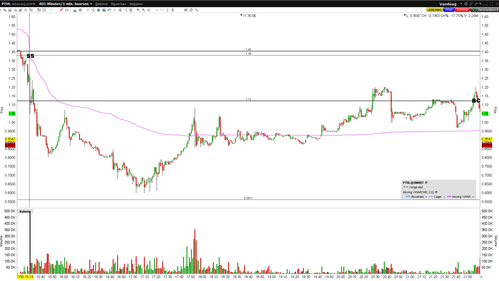 ENTRY: SRD, gister down -95%, Ik short 1.38. open 1.12, ziek veel geluk. Entry is zo goed dat het ook risk is. EXIT: sta al 50% in de plus door goede entry maar wil me aan het systeem houden en wachten tot -50% van de open of holden tot close. Raakte bijna mn PT maar kwam terug met een zieke bounce. Gecovered op 1.12 voor 19%. LES: was ff up 8k. Normaal bouncen dit soort plays die kapot geliquideerd worden nooit maar helaas deze wel. Ik hield me aan mn systeem maar helaas pakte het minder uit.