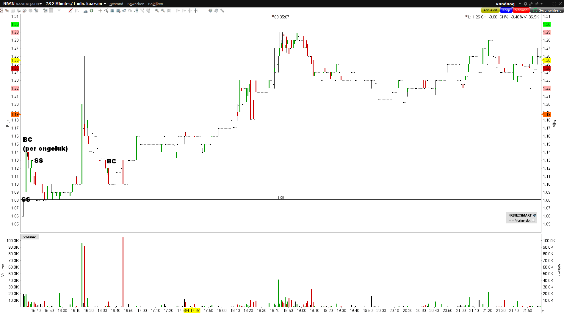 ENTRY: SRD, gister down ong -40%, wel laag volume maar doet genoeg volume vandaag en past in de strategie dus ik short op 1.08, open 1.08. EXIT: Word gelijk uitgestopt want was vergeten max daily loss aan te passen. Ik reshort op 1.13 maar krijg maar kleine size. Uiteindelijk besluit ik na een uur om het eraf te halen want volume is zo laag dat ik er niet meer in wil zitten. LES: Geluk gehad dat ik eerder covereden. Had zomaar een 15% loss kunnen zijn maar nu maar -4%. geluk bij een ongeluk.