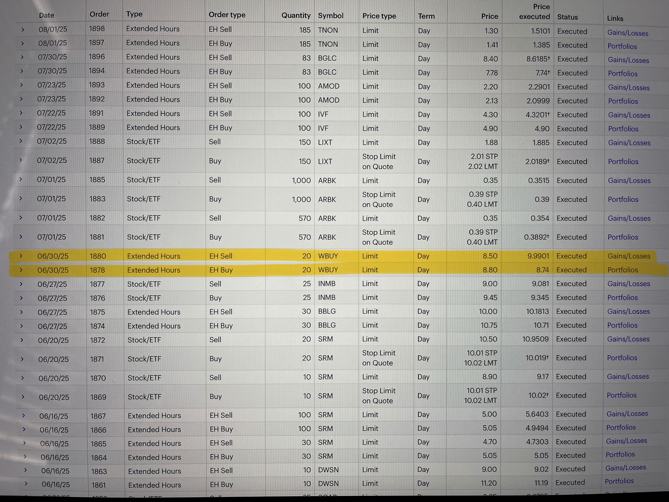 Entry date Jun 30, 2025: Bought 20 shares of WBUY for $8.74. RCT play, bought when it hit the top body of 1st red candle, big % gainer with stablecoin news, 7.4x float rotation, 479.67K float, former spiker. Goal was $1.50 spike. Risk/reward was 1:2, .75¢ downside $1.50 upside. Exit date Jun 30, 2025: Sold 20 shares of WBUY for $9.99. Great spike, moves fast, sold into strength.