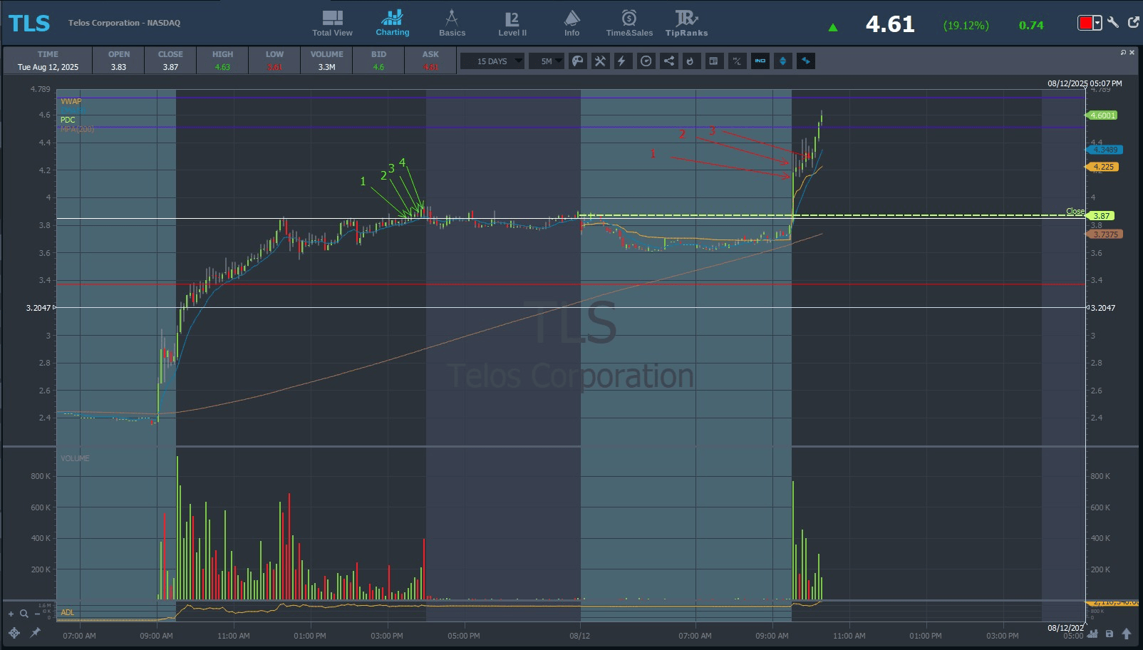 Day. Entered this on a VWAP Hold HOD& selling into the gap-up/run-up on this ER winner. Started sizing EOD w/50@3.83, 50@3.85 & continued as it stayed near this LVL which was HOD or B/O of HOD. 50@3.85 & 50@3.87; av 3.85, risk 3.36, TGT 4.87+, but exiting on spike/gap-up. Started exiting during MS & after consolidation; 1st 100@4.14, 2d 50@4.24, last 50@4.29; av 4.20. Great trade, but nerves made me sell early because I'm not good @ MS.