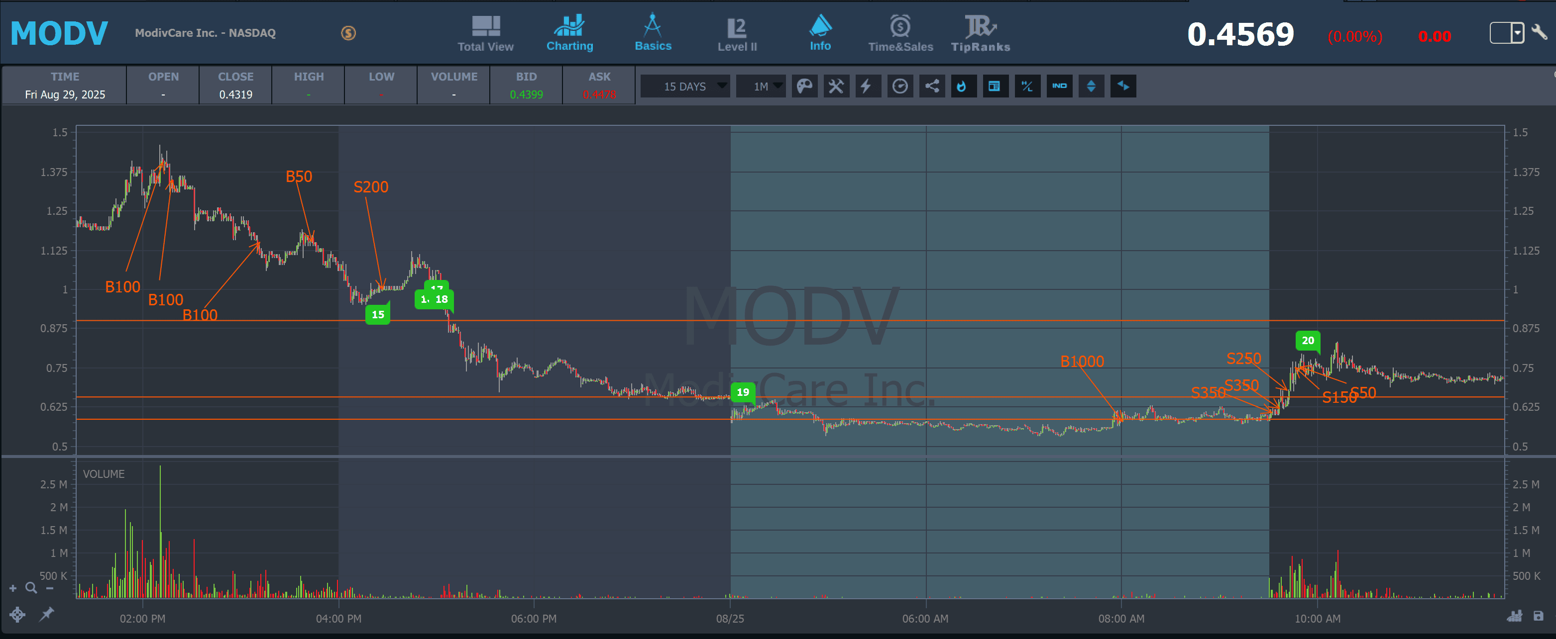 Scary trade. On 8/21 the stock gapped down more than 50%. Seemed to find .75 as a key level. PM 8/22 the stock got up to 1 at 7:30 before coming back down to .80 at the open. Made a great run up to 1.40 by 11:30. I saw it retesting the HOD around 2:15 and got in. Double top. Should've cut it when it failed but thought it could squeeze being a Friday, good volume, low float, etc. Came down hard over the weekend so I bought 1000 shares PM 8/25 with the HOPE of a bounce. Avoided a larger loss