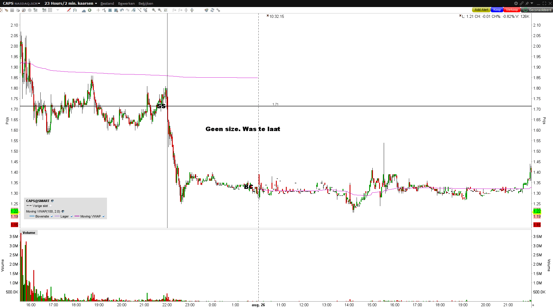 ENTRY: DD1, up ong 60%, weinig cash dus heb en nieuwe dilution dus heb veel vertrouwen. Wel klein bedrijf dus uitkijken. Ik short maar ben te laat en krijg er vrijwel geen size op. Kon daarna niet meer enteren want stock ging snel omlaag. EXIT: covered net voor AH close omdat posititie te klein was om te houden. LES: hier ben ik wel van over de zeik want dit was een persoonlijke fout. Dit had gewoon een win kunnen zijn van 4k. Zorg ervoor dat je niet te lang bezig blijft met voorbereiding.
