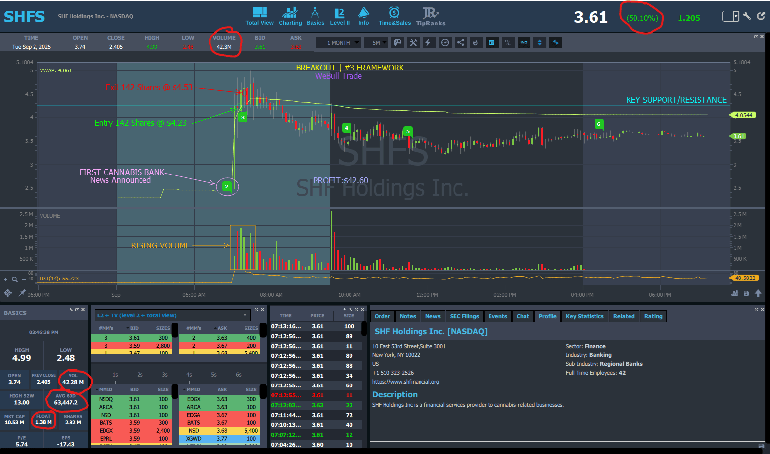 News was announced of SHFS being the 1st cannabis bank that cause the price to spike $2.00 a share before settling & creating a new support @ $4.24 so made entry with the goal of $0.20 - $0.30 profit. This was a fast mover & did dip after entry but climbed right back & created a new HOD. Exited after goal of $0.30 was met to avoid over staying. Great plan, discipline, entry & execution!