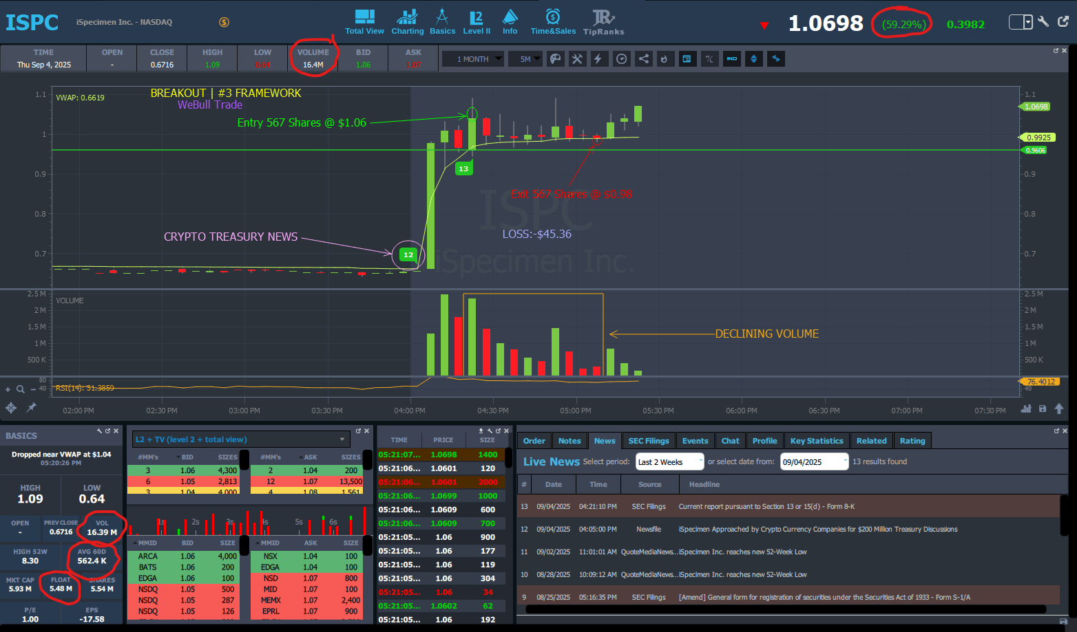 Frustrating loss but they happen. News was announced of a potential crypto treasury & the price spiked nicely after the announcement. Made entry @ $1.06 during consolidation after initial spike to $1.00 & thought I had made entry as the price was curling up but the momentum didn't last & price dropped $0.02 away from my stop loss so exited to play it safe. Just because the price drops doesn't mean you have to wait till your max loss to get out. Okay with the trade because I followed my plan.