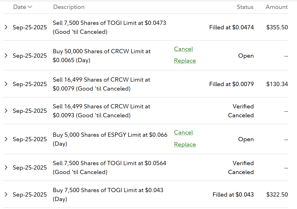 I got in this trade because it was OTC #1 Biggest % Gainer with Volume on 9/24 & is a 3-time former runner since 12/3/24. Dip bought 10:15 $0.043 32% off 8:30 $0.0629 HOD & at yesterday's + earlier this morning support area. I set my Limit Sell for $0.0564 for the $100 profit just under 9:43 $0.058 bounce peak. Every attempt became a lower high 12:02 $0.0539, 12:13 $0.0525, etc. So I got out, as it couldn't reclaim $0.0513 VWAP, 12:54 $0.0474 to preserve my 10% win.