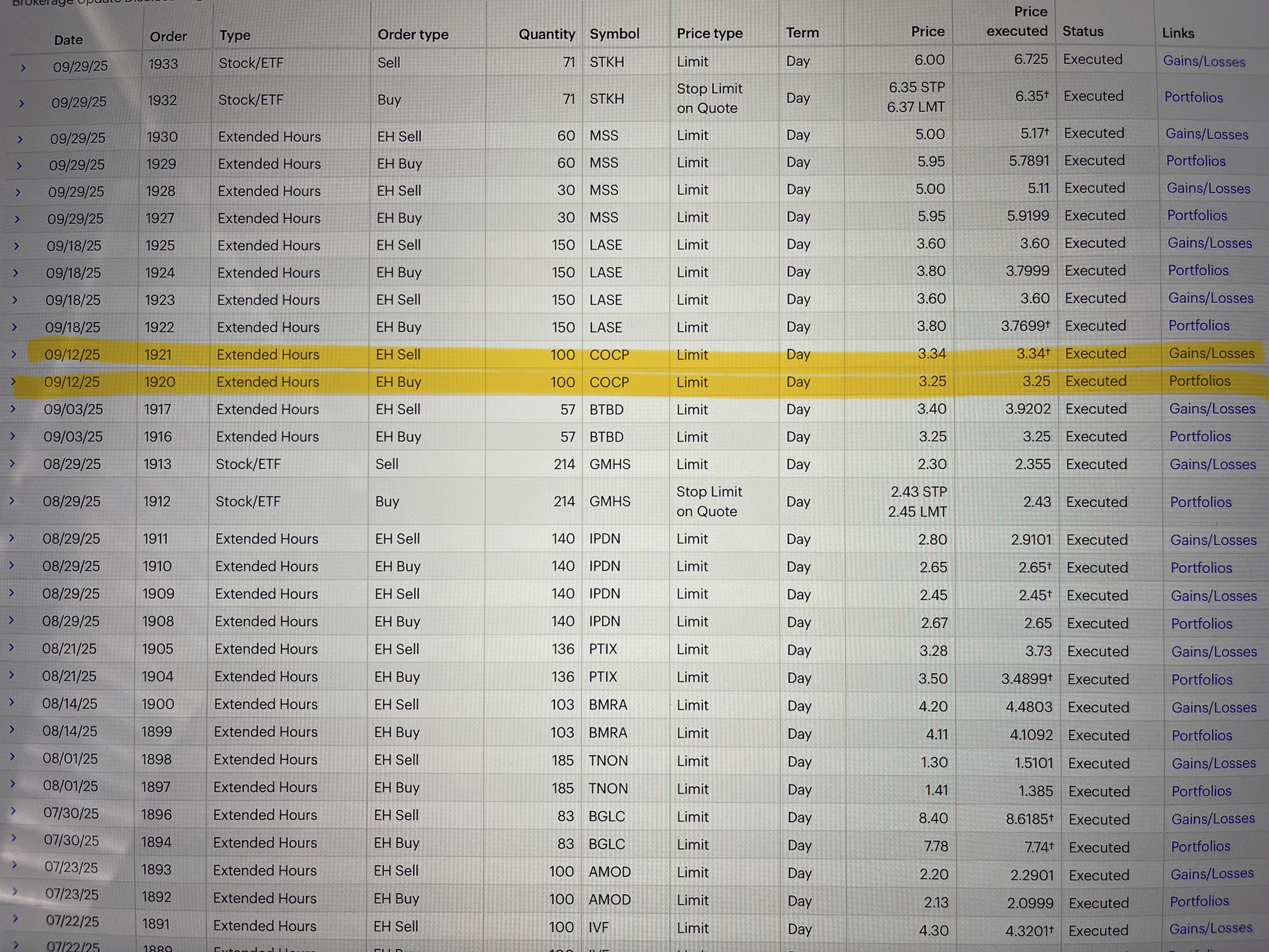 Entry date Sep 12, 2025: Bought 100 shares of COCP for $3.25. RCT play, bought in pre-market when it hit the top body of the 2nd red 5-min candle, big % gainer with BNC alert, 4x float rotation, 7.4M float, former spiker. Goal was .60¢ spike. Risk/reward was 1:2, .30¢ downside .60¢ upside. Exit date Sep 12, 2025: Sold 100 shares of COCP for $3.34. Gave it time, struggled to squeeze, 2nd RCT’s usually have lower chances of follow through, sold for a tiny win.