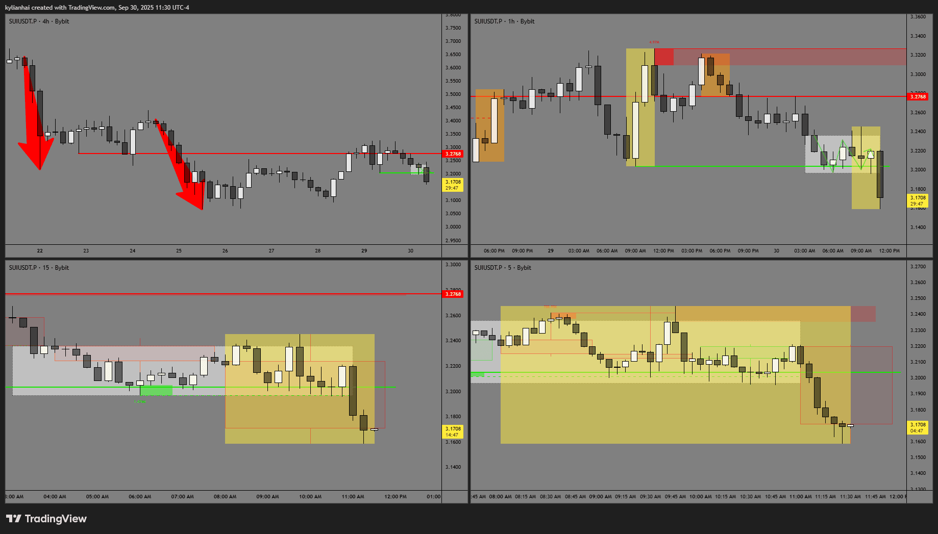 On the 1h I saw a double bottom with wick rejections, but the 4h had already hit resistance and was trending down. I entered on the 1m and lost 4 trades before catching a small bounce (I expected a bigger bounce, thinking the 1h DB was strong and the 4h had pulled back enough). The 1m is too messy, and I should stop using it. Lesson: higher timeframes outweigh lower ones, and the 1m is a mess (for me). I need to track winrate when the 4h and 1h align versus when they conflict.