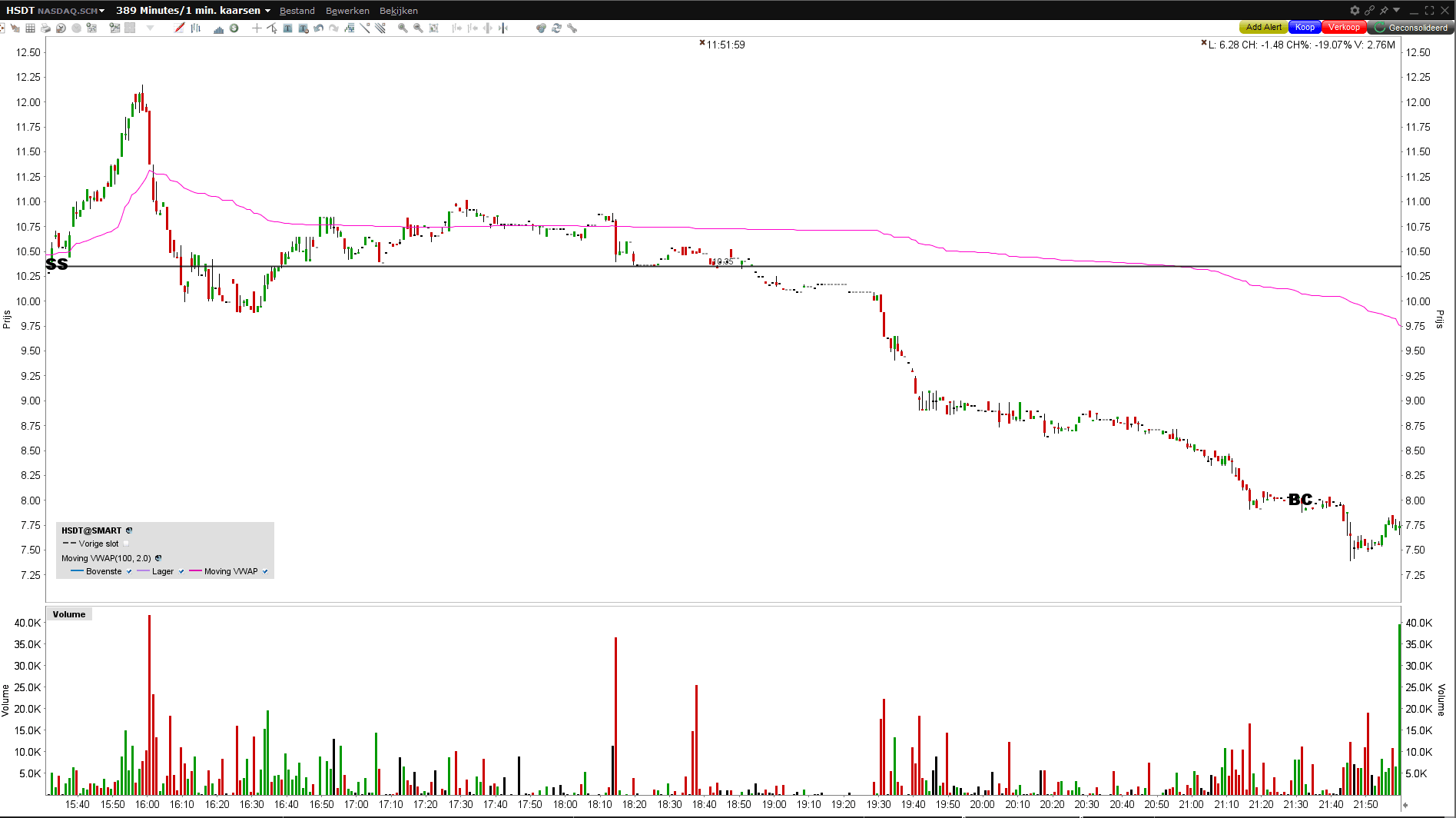 ENTRY: SRD, down -35% gister. Niet een hele grote fan van dit aandeel want heb hier al een keer een max L op gepakt met een doji. Maar past de strategie dus ik short. avg 10.36, open 10.35. EXIT: flinke pump van ong 18% begin vd dag. Was er vrijwel zeker van dat er weer een max loss aankwam maar stock topped en fade de rest vd dag erg mooi en ik cover op 8 einde dag. LES: erg mooi uitgepakt. Erg blij mee.