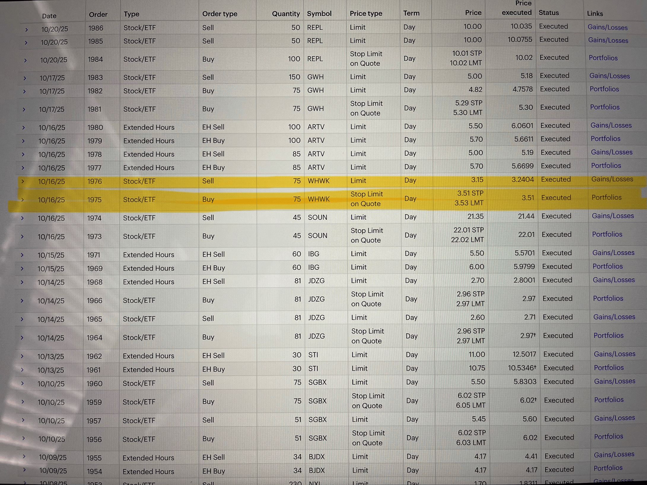 Entry date Oct 16, 2025: Bought 75 shares of WHWK for $3.51. DNR play, bought after 9:45 when it hit the oracle signal after a big dip-&-consolidation at the open, big % gainer with news, 2.1x float rotation, 23.6M float, former runner, day 1ner. Goal was .50¢ spike. Risk/reward was 1:2, .25¢ downside .50¢ upside. Exit date Oct 16, 2025: Sold 75 shares of WHWK for $3.24. Gave it time, didn’t squeeze, sold at risk, higher float, possibly made it harder to squeeze.