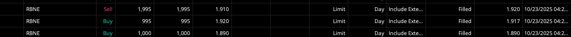 The was a trade off a wedge pattern breakout. I selected 1000 shares and was only filled 5 shares. I thought it was my mistake so I bought 995 more. Then I got filled all 1995. There must have been a delay in getting the fills. I think it's because I was using "last price" on my order from WeBull then the price moved above the submitted price. I got out since I was in a larger position than I wanted.