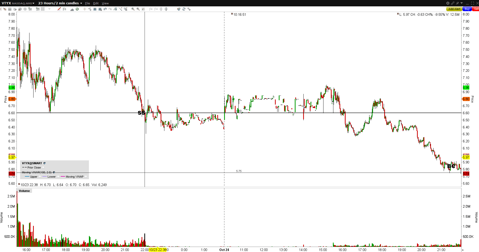 ENTRY: DD1, up ong 70%, groter bedrijf van ong een half miljard en genoeg cash dus verwacht er niet veel van maar past de strategie dus ik short 6.60. Close is ook 6.60. EXIT: Covered einde dag deel op 5.75 rest op 5.90 voor een 5.85 gemiddelde. LES: Prima trade van 11%. Niet verwacht eigenlijk dat het nog best ver omlaag zou komen. Lekker meevaller. Thijs heeft ook geld verdiend met deze play en was ook zn eerste doji dus shout out naar hem <3
