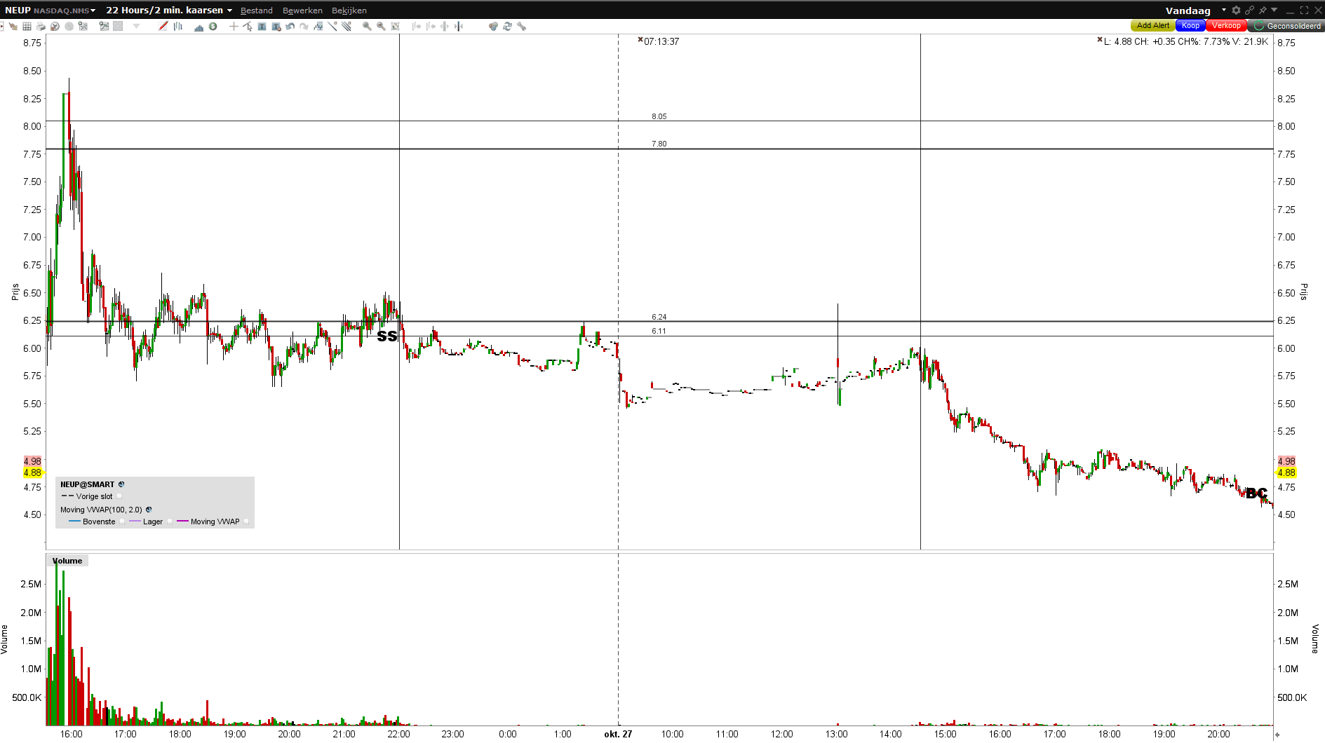 ENTRY: DD1, up ong 55%, klein bedrijf dus voorzichtig zijn. Ik short 6.11. Close is 6.24 dus beetje kutentry maar ik hou mn size gewoon. EXIT: Mooie fade de hele 2e dag. Doel was coveren in 4.55 omdat het aandeel al bijna terug bij af is na de run van vrijdag. Dat halen we net niet maar cover op 4.70 wat ook heel netjes is. 23% gain. LES: Heel blij met deze trade. Dojis werken de laatste tijd echt niet normaal goed. Hopelijk blijft dit nog even doorgaan.