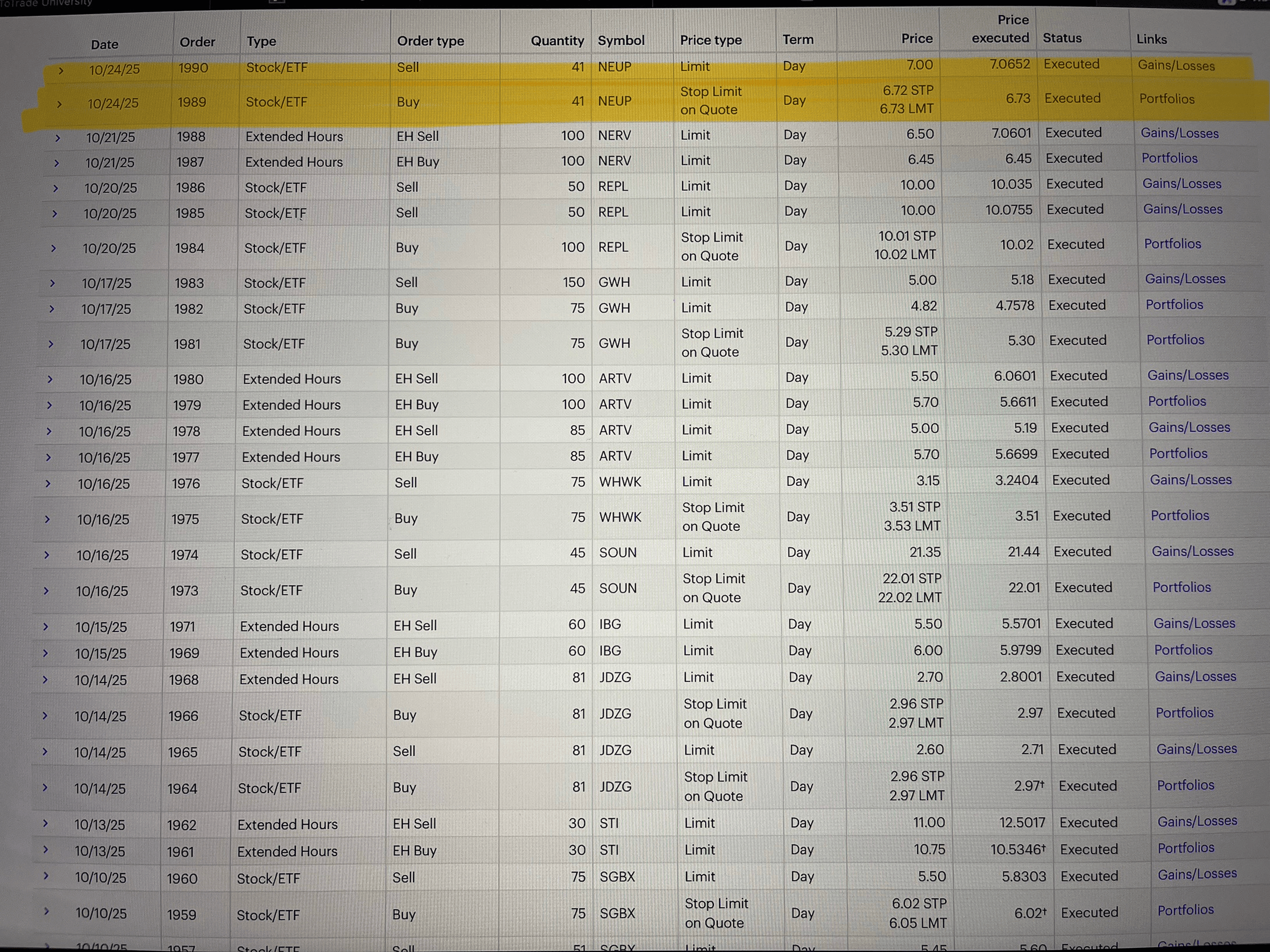 Entry date Oct 24, 2025: Bought 41 shares of NEUP for $6.73. Double tap play, morning buy when it reclaimed the oracle signal the 2nd time after a failed DNR near the open, big % gainer with news, 16.3x float rotation, 2.32M float, former runner, day 1ner. Goal was $1.50 spike. Risk/reward was 1:2, .75¢ downside $1.50 upside. Exit date Oct 24, 2025: Sold 41 shares of NEUP for $7.07. Squeezed, sold at M/R rejection, choppy, kept going after, don’t panic sell!