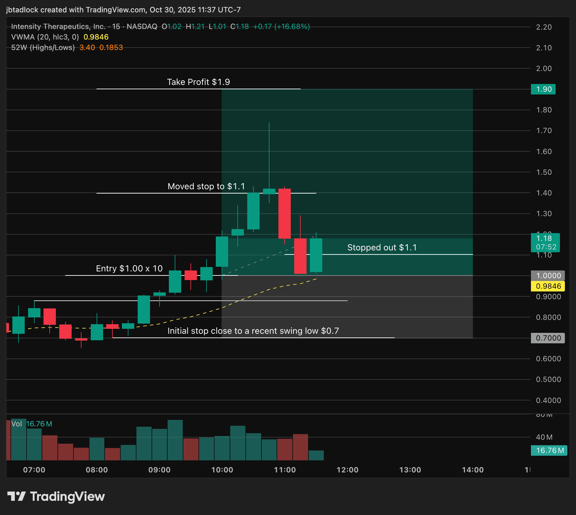 Saw a break of recent high and set an order at $1.00 x 10 (keeping risk <= $10 while I find my style). Stop was close to a recent low ($0.7). Take profit was at a 1:3 ($1.9). Once price hit 1.4, I moved my stop to 1.1 to lock in some profit. Price ended up hitting my stop and then started to bounce, so I probably moved my stop too soon. Since I'm under the PDT rule, instead of re-entry, I'll wait for a new opportunity tomorrow.