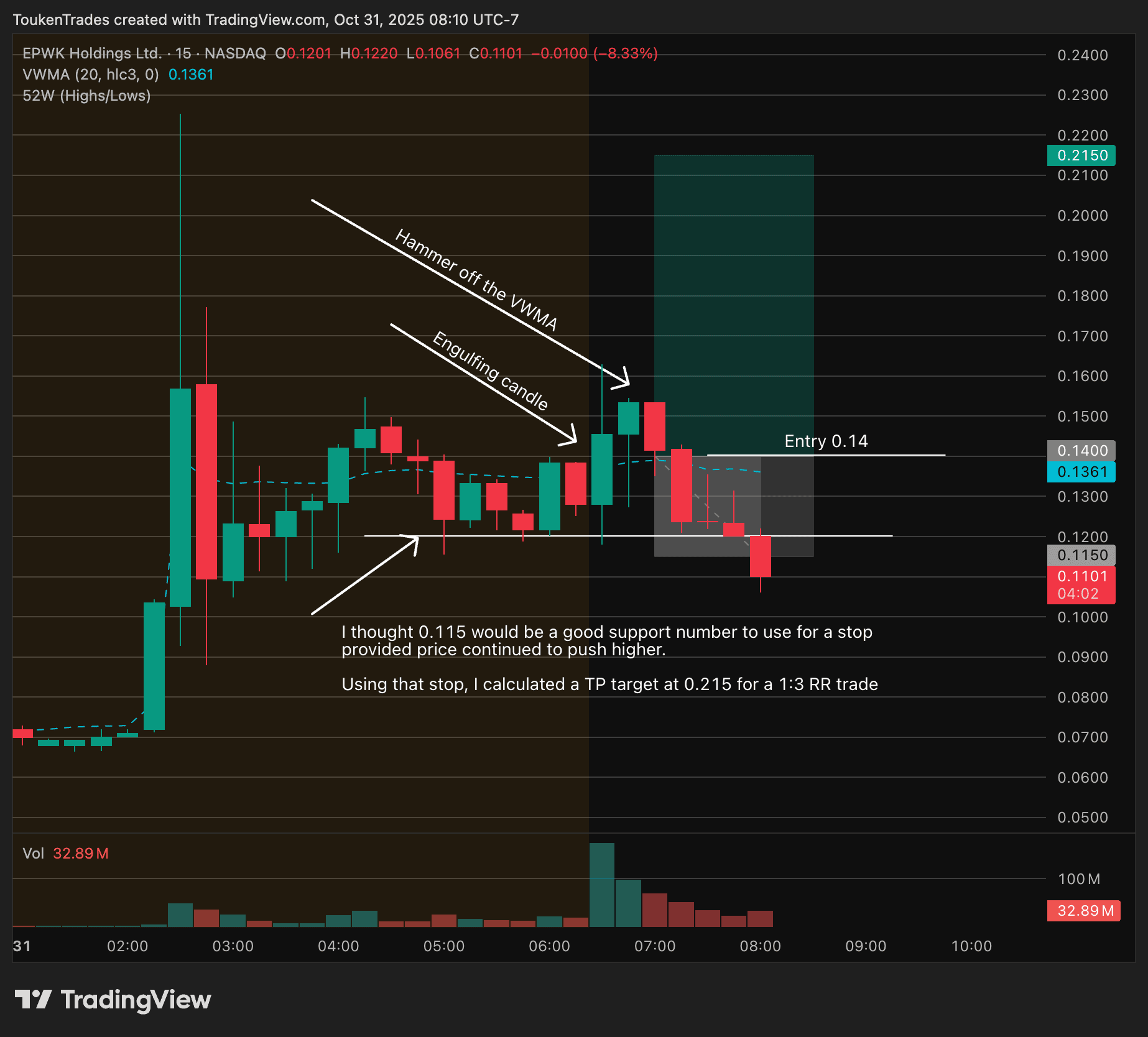 I saw the signal on Oracle, decided to enter around 0.14 after seeing some bullish PA off the VWMA. Using the 15m chart, I decided that if the bullish PA would continue, I'd set my stop at 0.115 and calculate a 1:3 TP target of 0.215. Ultimately stopped out, but I'm happy with having a plan and executing it.