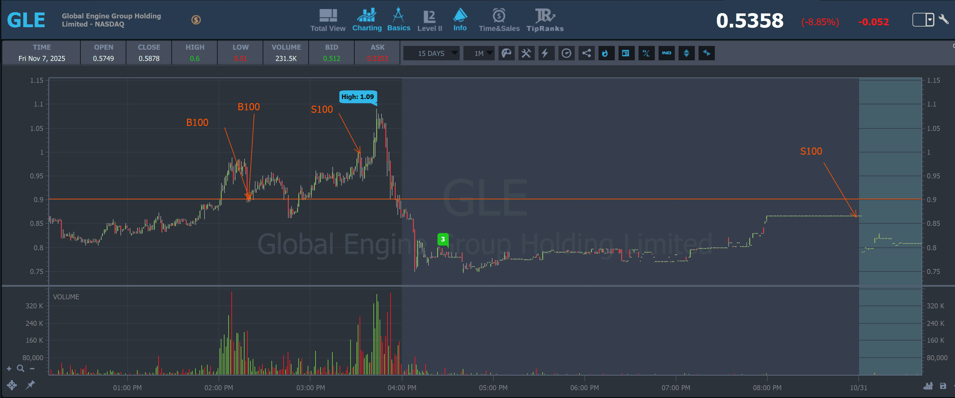 Stock spiked AH 10/29 from .65 to 1. Got up to 1.10 PM 10/30. Came all the way back down to .70 before the open. Spiked back up to 1 by 10:07. .80 and .90 were key levels. So In bought when it came back down to .90 after running up to .99. Not sure what I was doing around 3:40 but I clearly missed my best exit opportunity. Sold half when it got back to 1. Must've been busy with work. Good lesson. Not a great exit selling the rest of my position holding through the dip to .75.