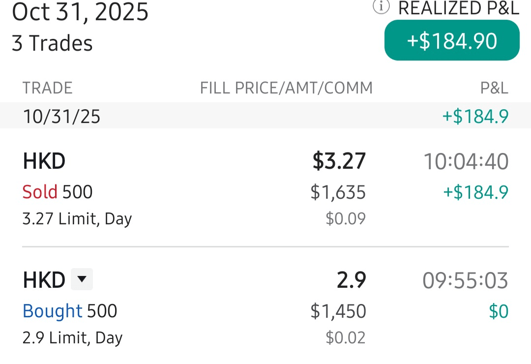 This was an ideal set up for me. I have missed out on a few trades like this and lost huge potential. However HKD I love this setup. Chart jumps in the morning and has some sideways consolidation. Plenty of volume. I took profits and could not manage longer. It ran over a dollar more after. Overall a perfect trade very happy about this. I did my job!
