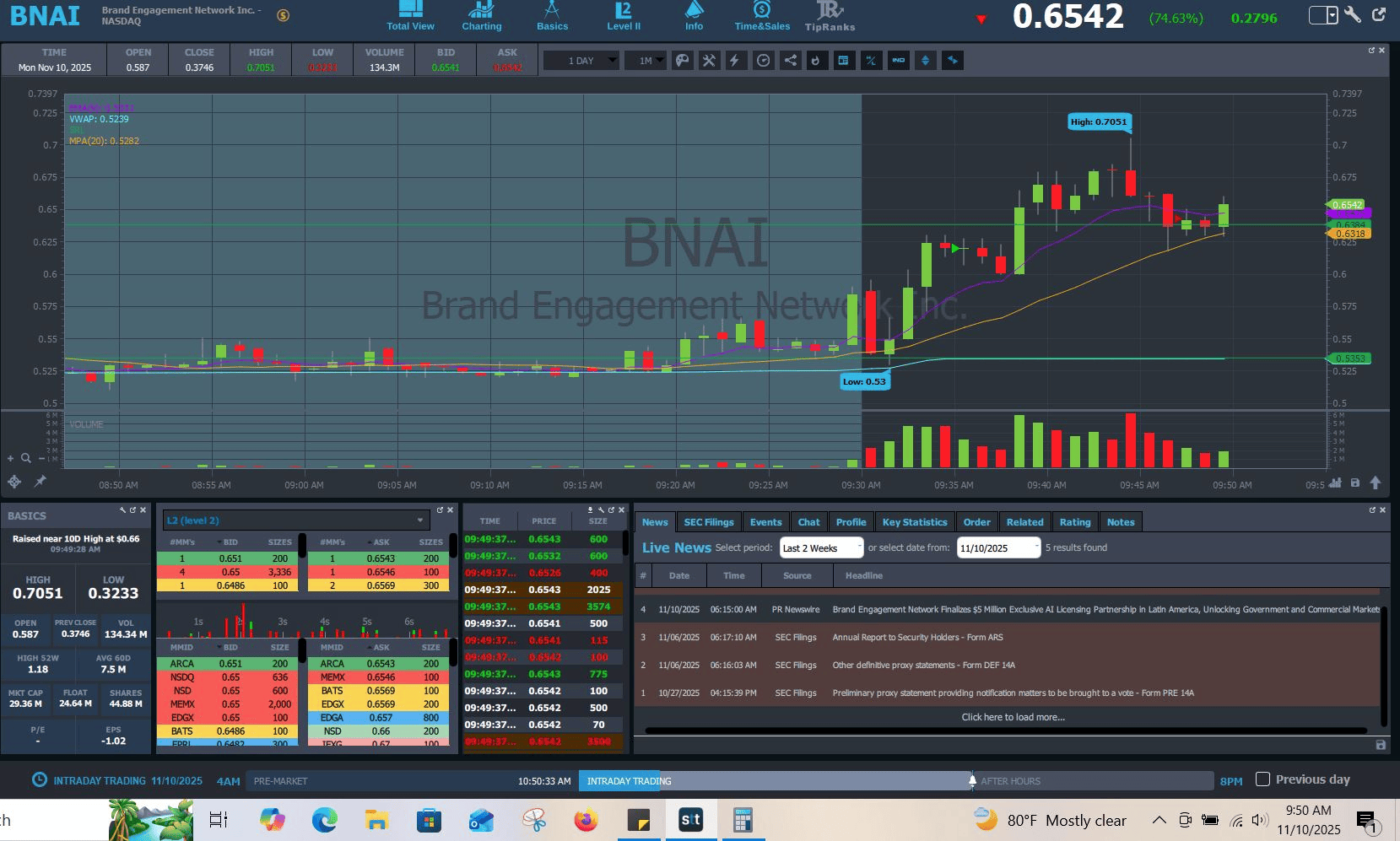 Tim Bohen-StocksToTrade:"DailyMarketProfitsAlert11-10-2025$BNAINicebaseandheadedtowardssignalSignal:$0.61Stop:$0.54Target:$0.80" I sold when the body of a red candle printed below the 9 EMA. As Caleb H said, when this occurs, the structure of what's happening changes, and sellers are in control. I could have locked in 10% if I just set my limit sell order at 0.68. If I stuck with Tim's plan, I would have profited a little over 30%. At the same time, it's my responsibility to manage the trade.