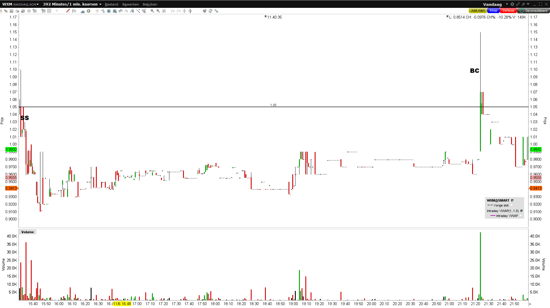 ENTRY: SRD, gister down ong -40%. Doet weinig volume. Eigenlijk te weinig maar heb het voor elkaar gekregen om het erin te krijgen. Short 1.03. Open 1.05 bietje kut. EXIT: Ik move stop naar breakeven en word daar uitgestopt met best veel slippage door het lage volume. LES: had in dit geval beter mn normale risk moeten houden maar boeie. -1k is te overzien.