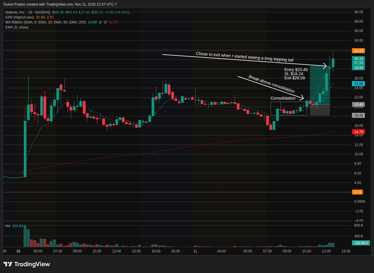 Saw a breakout above some consolidation on the 9EMA. Took a long with a stop below the consolidation range. I chose to exit when I started to see a long topping tail. I got scared and exited early when seeing the topping tail because MSPR ate up some of my capital today (shouldn't have traded it as it was above my personal 1-$20 capital rule because webull forces you to buy 100 shares when a stock is < 1.0, won't do that anymore). Definitely happy with a 39.5% win though.