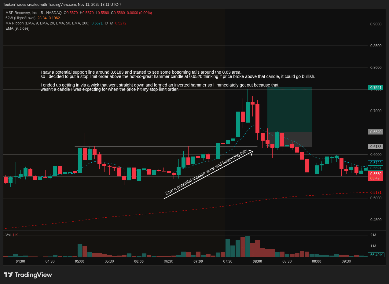 I was biased for getting back in to this trade due to an Oracle signal today. I thought I could get back in for a bounce using a stop limit order higher than a not-so-great hammer candle (not topping tail, so I thought it was okay). Upon entry when a wick triggered my stop order, it formed an inverted pinbar and I got out immediately because that's not what I wanted to see. I still didn't like using a position size of 100, but I was stubborn and hoping for a successful Oracle trade...