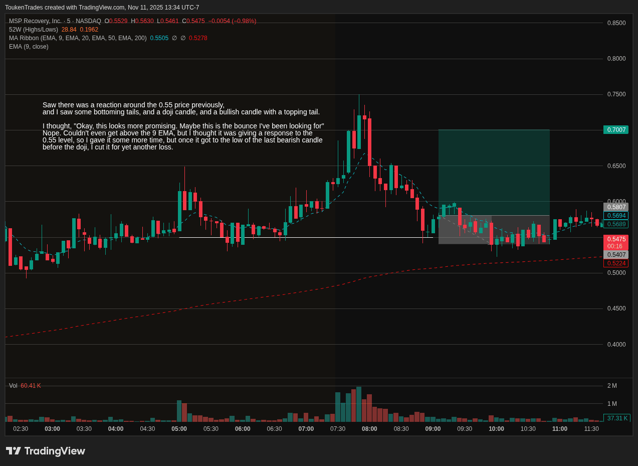 I was too stubborn on this ticker today. I kept thinking, "It's an Oracle signal, it should work!" instead of just listening to my own judgement of, "This ticker hasn't been responding in the way I want it to, this is a dud ticker for today." I thought there was a good bounce from the 0.55 level, but it ended up fizzling out and failing to gain bullish momentum _again_.