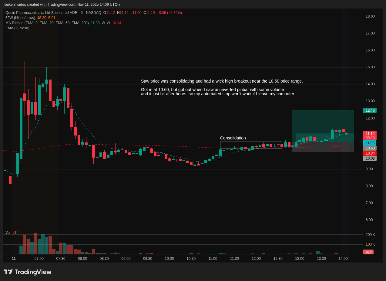Saw some consolidation around the 10.50 range with a wick breakout. Got in around 10.60, but once it got to the after hours, I decided to exit when I saw an inverted pinbar with some volume. After hours I'm not going to be around my computer looking at the screen and Webull doesn't allow for stops to work after hours, which sucks. I really wish I could just set a stop and profit target and have them trigger during extended hours, but that doesn't seem to be a thing for stock brokers, sadly.