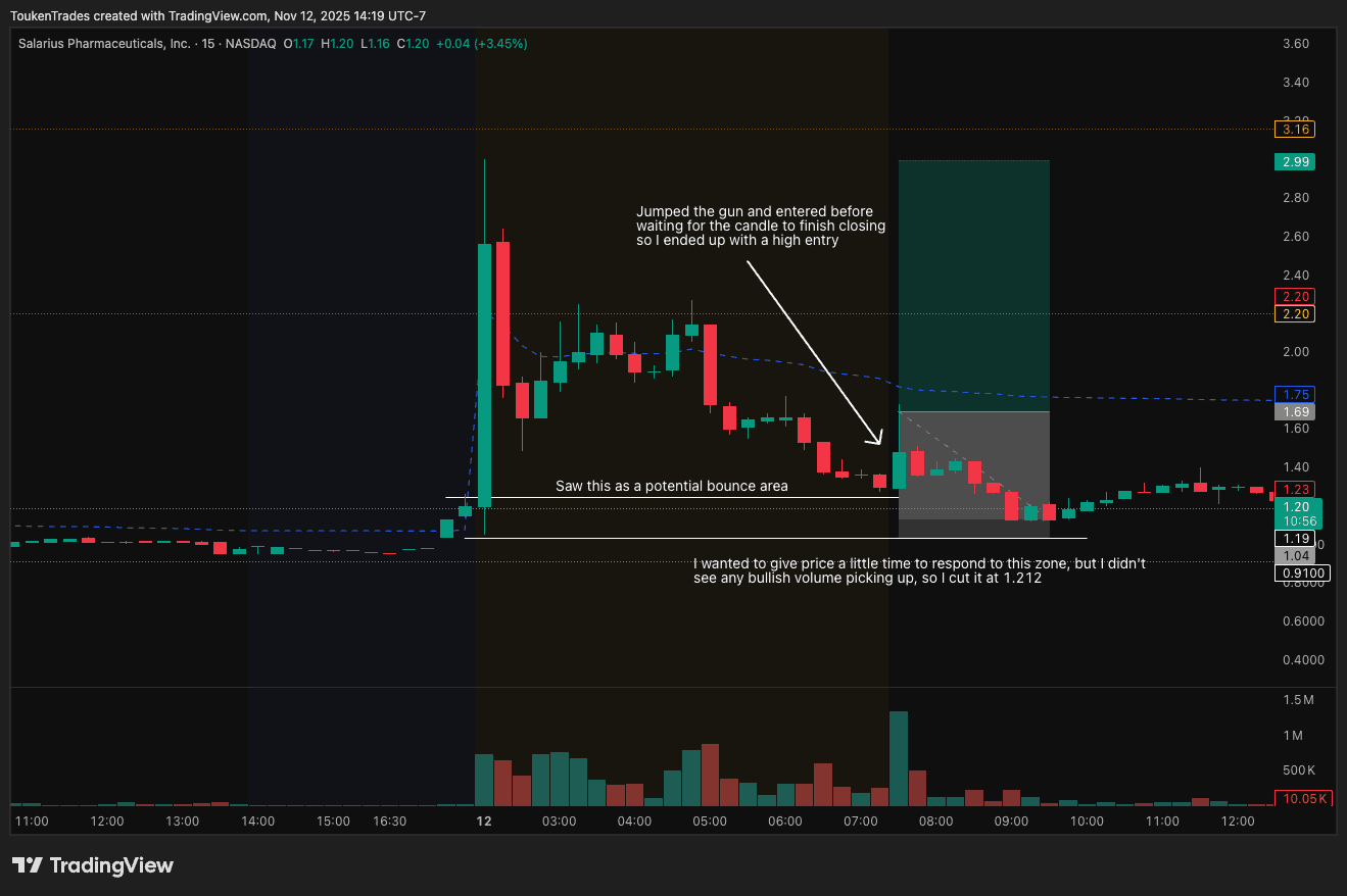 I thought I saw a little demand zone around 1.2. I jumped the gun and entered before price actually got into the zone and then waited almost through the whole zone before cutting the loss. I thought since I saw volume on the candle I got in on that more bullish price action would follow, but I never saw it and held too long now that I'm looking at it in hindsight