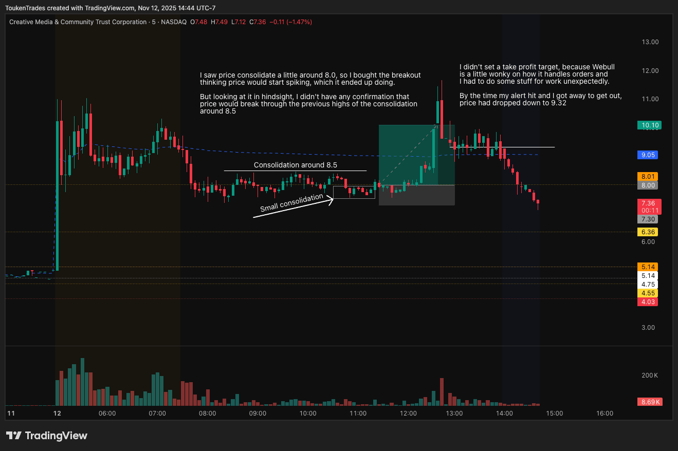 I saw price was consolidating for a while, then I saw a smaller consolidation area and decided to trade the breakout with a stop below the smaller consolidation zone. I had an alert set for a 1:3 target, but had some stuff at work come up and wasn't looking at my phone. By the time I got done and closed my trade, I exited for a smaller win than planned, but a win none-the-less