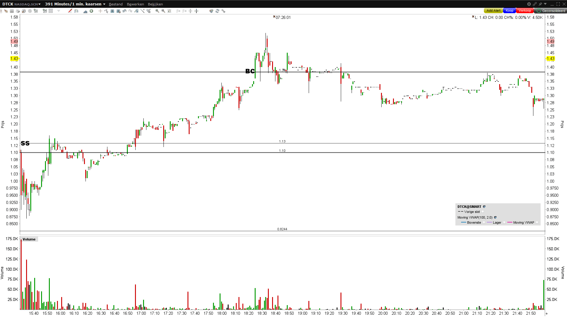ENTRY: SRD, -45% gister. Met gap down erbij -80% ong. Ik short 1.13, open is 1.10 dus prima entry. EXIT: stock dipt best flink maar net niet -25% van mn entry dus ik hou mn normale risk aan. Moest ook gaan volgens mij. Uiteindelijk uitgestopt voor max L op 1.38. LES: Jammer. Maar dit is niet alles want de dag word nog erger.