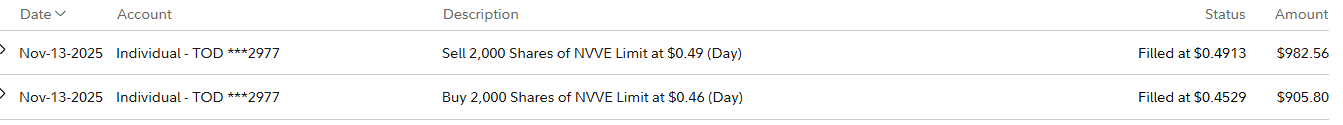 Oracle based play. Several other tickers hit signal and Long Delta movement, but chart patterns (mostly top of Step 2, with narrowing range and declining volume) didn't meet risk and predicably declined or consolidated. Oracle Long Delta tripped on NVVE signal and stock (chart & volume) made room for small (safe) profit. NVVE topped out in 50's then failed. Happy with seeing .49s were near top, time to get out.