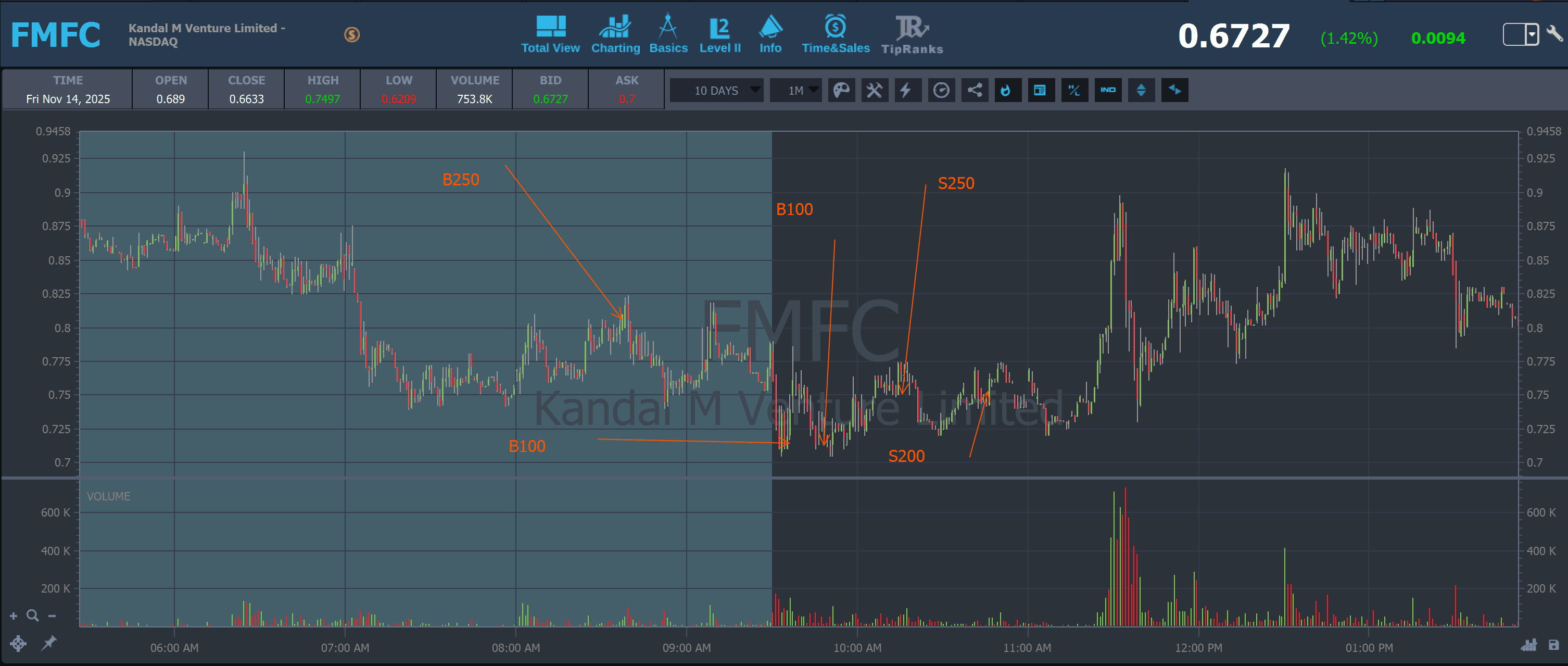 Big spiker AH 11/11. Went from .55 to 1.10. Came back down to the .70s PM. I thought it could BO if it broke .80. Bought more on the dip at the open. Bought more when it came back down to .70. Sold on the bounce. Didn't think it could get back up to the .90s. Volume was fading. Didn't know what it was going to do so got out. Big vol come in at 11:30 and squeezed it up to .90.