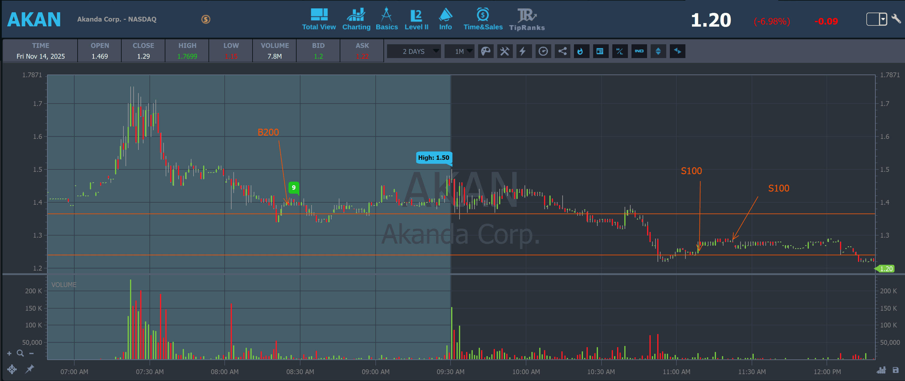 Stock spiked AH 11/13 the company was researching the requirements for a full cultivation license. Went from 1.30 to 1.60. Got to 1.70 PM 11/14. Came back down to the 1.40s which I saw as a key level. Should've sold on the spike at the open. I was risking 1.30. Sold after it dropped hard and fast. Cut losses quickly!