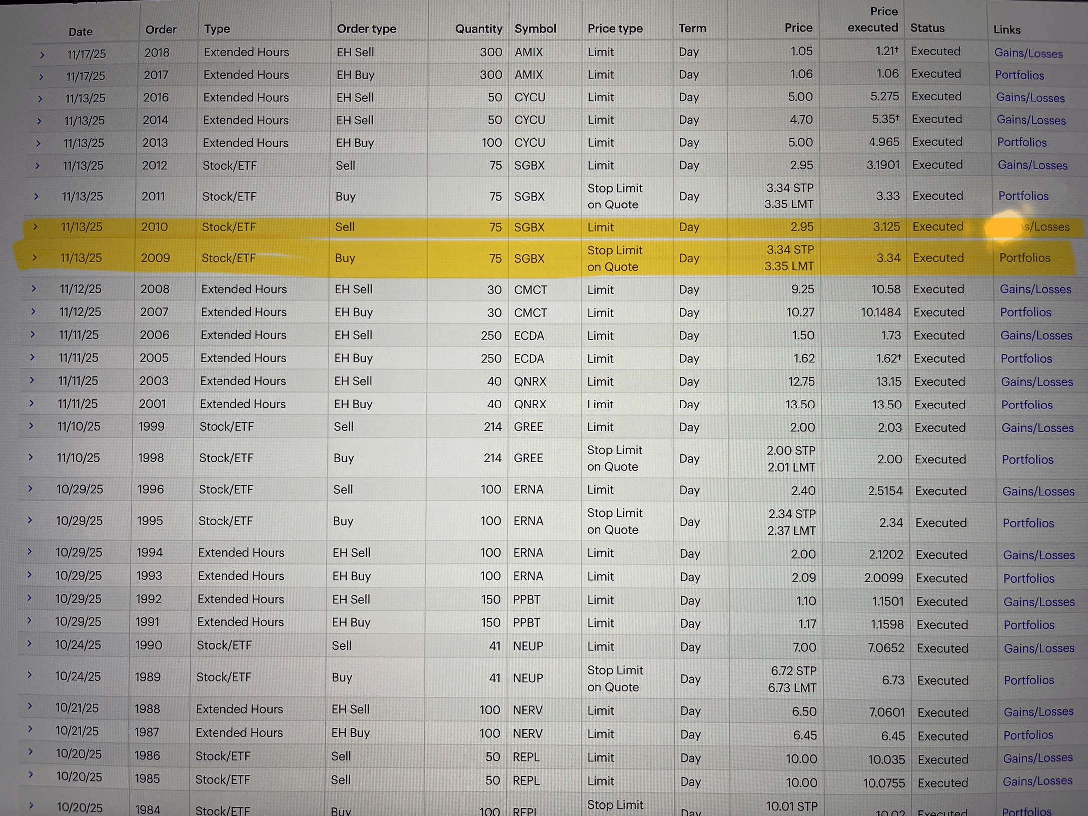 Entry date Nov 13, 2025: Bought 75 shares of SGBX for $3.34. Afternoon reclaim of VWAP play, bought when it broke intraday resistance above VWAP & below oracle signal, big % gainer, momentum mover, 158x float rotation, 404.9K float, former spiker. Goal was .60¢ spike. Risk/reward was 1:2 .30¢ downside .60¢ upside. Exit date Nov 13, 2025: Sold 75 shares of SGBX for $3.13. Fake out, choppy, sold as it did not do what I wanted.