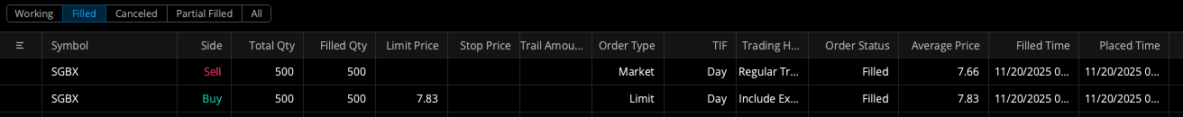Momentum trade. Let it go too far before cutting losses. Need to get out quicker.