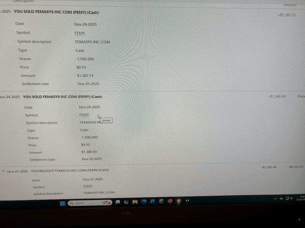 Entry comments: Not a fan of FEMY but seems it wants $1 after recent high and now above 5 NOV ZXGPT entry of above $.78 and target of $97. Was on RB scanner and reco by JW. He got in at $95.5 and thinks could run. Recent high of $1.11 I might target $1.04 area for overnight. It got to $.967 today so should have closed out for profit instead of holding.