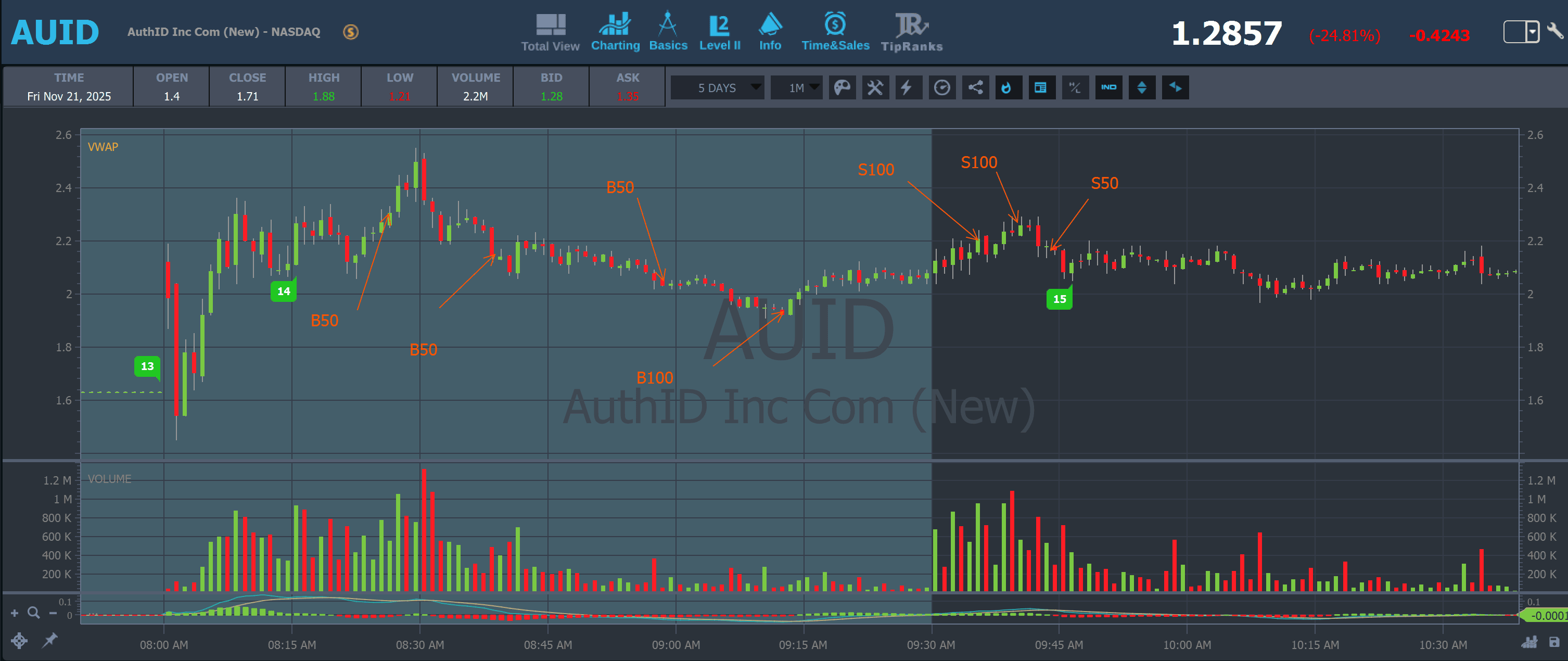 News came out PM that the company joined Nvidia Connect to advance enterprise and AI agent security innovation and opportunities. Stock went from 1.60 to 2.20 in 10 min. When I saw the consolidation around 2.20 I bought it thinking it could BO. It got up to 2.50 after I bought it, but then faded slowly back down to 1.95. I averaged down along the way. Got back above 2 before the open and then steadily climbed up to 2.30. Sold near HOD. A little stressful, but happy with my trade.