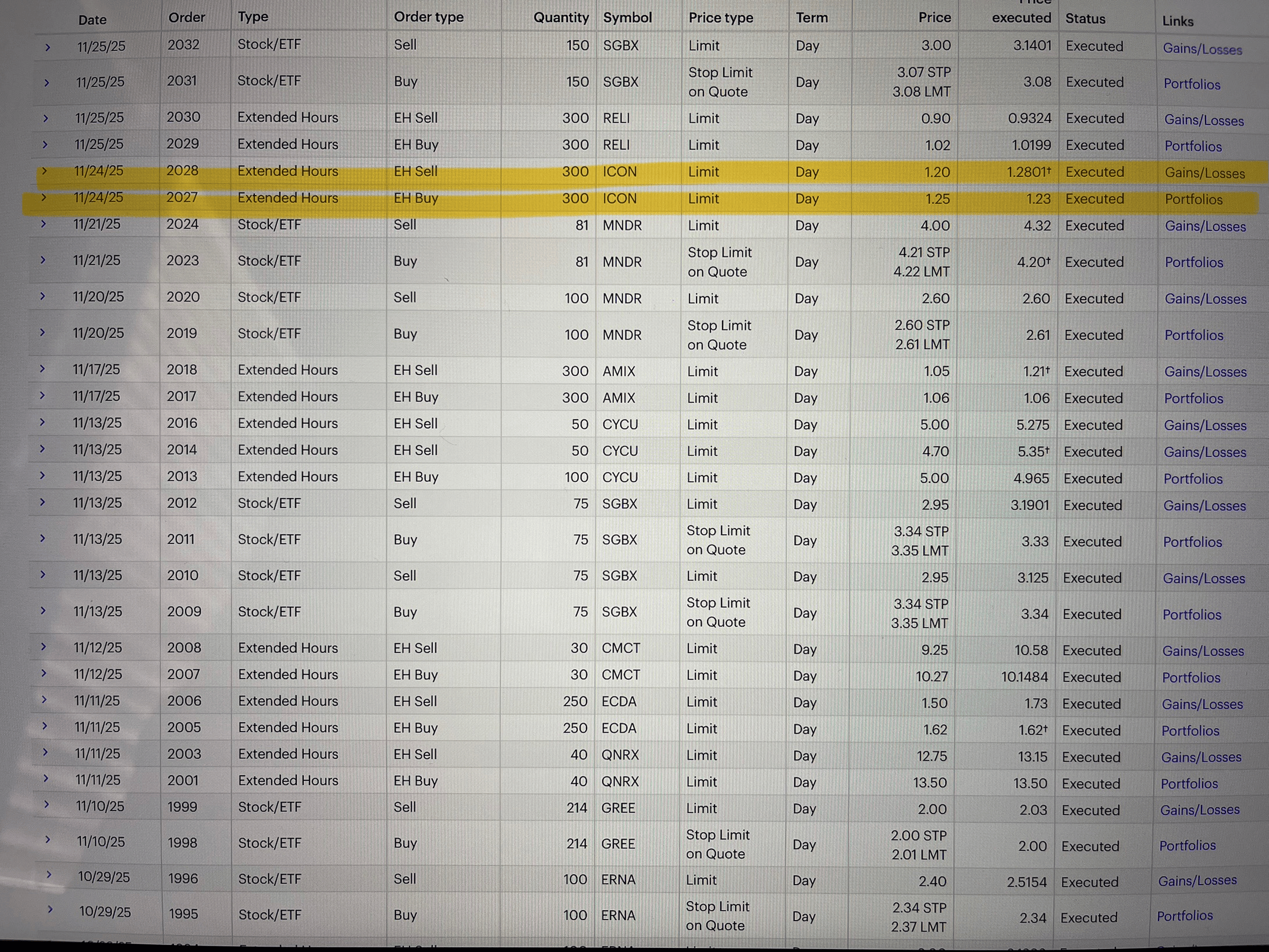 Entry date Nov 24, 2025: Bought 300 shares of ICON for $1.23. DNR play, bought in AH when it hit the top body of the first red 5-min candle, big % gainer with morning news, 4.1x float rotation, 2.16M float, former spiker. Goal was .20¢ spike. Risk/reward was 1:2, .10¢ downside .20¢ upside. Exit date Nov 24, 2025: Sold 300 shares of ICON for $1.28. Spiked, gave it time, couldn’t break intraday resistance, sold on the dip.