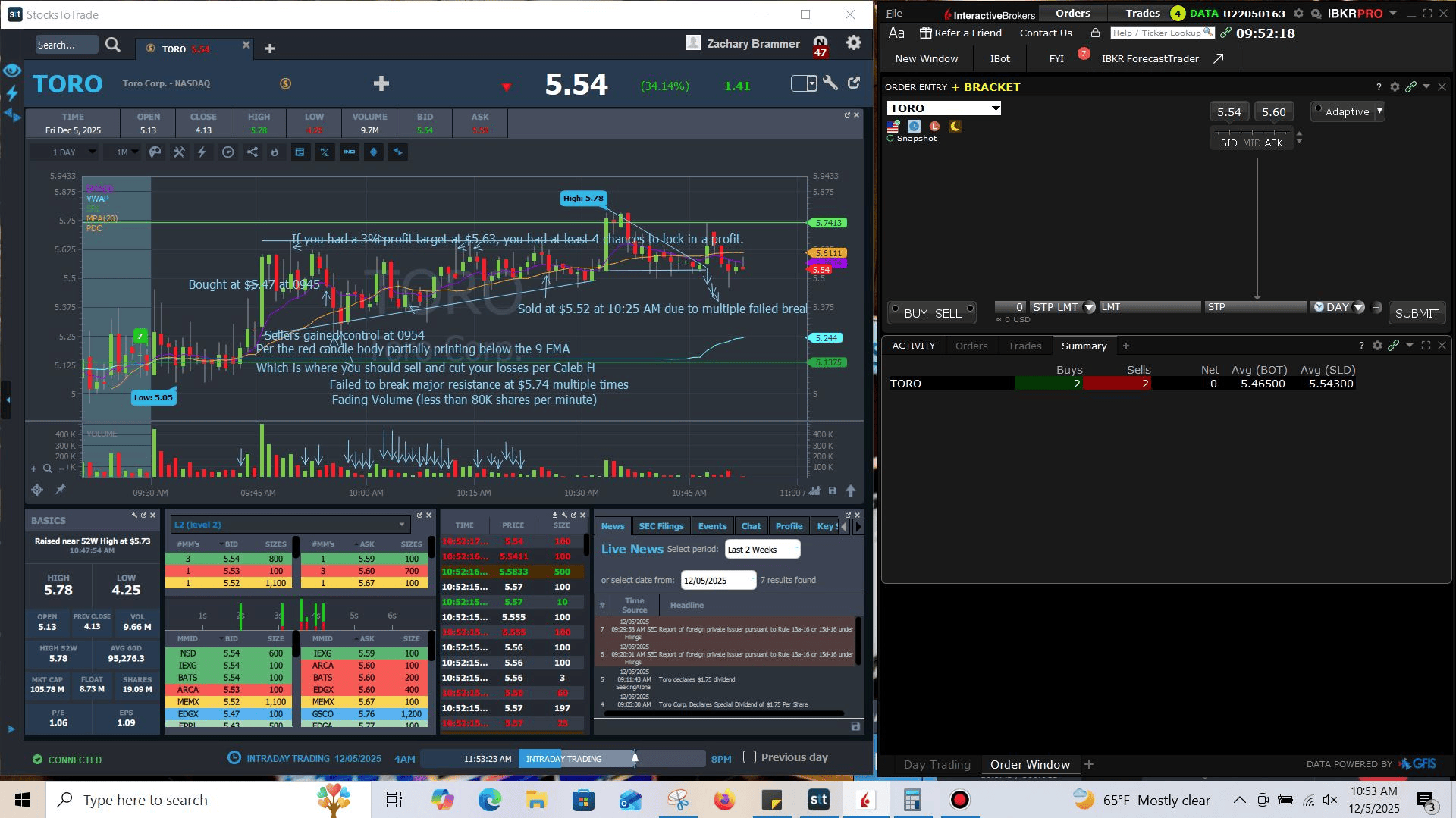 1.9% Revenue increase. $1.75 dividend. Pretty boring news. I bought into strength (the highest buy volume candle of the day) at 09:45 AM at $5.47 (1 cent above the signal price). At 09:49 AM, the stock increased to $5.65. If I used a 3% Profit Target and a 3% Stop Loss, my stop loss wouldn't have been hit, and I could have locked in a 3% profit at $5.63. In fact, I had 4 chances to lock in a 3% profit at $5.63 before the stock formed an ascending wedge to reach a new HOD at $5.78.