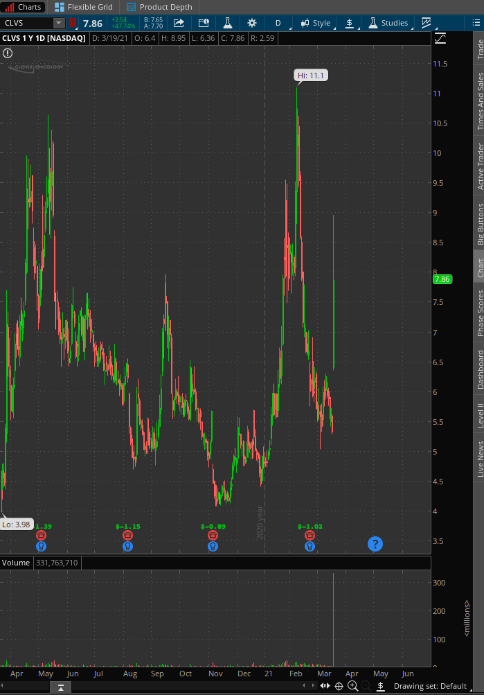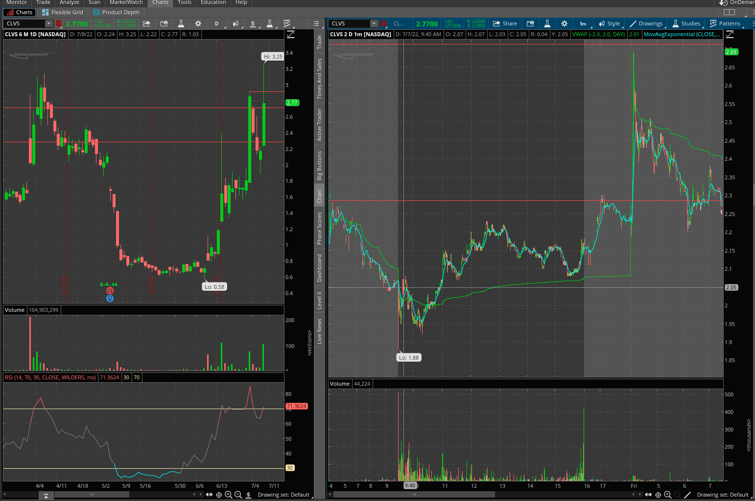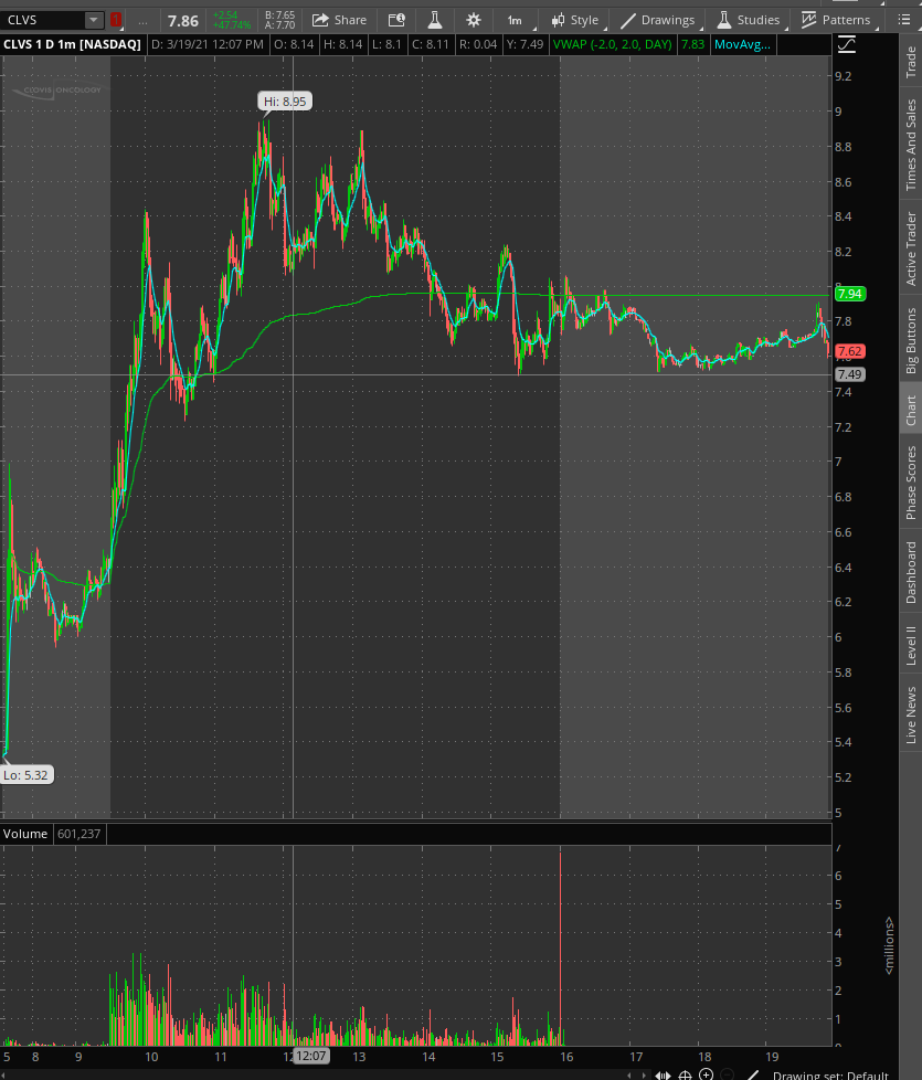 $CLVS TRADE- don't really mind this trade even though it had a lot of resistance on the daily- was above VWAP, my entry was just below VWAP, went up a little but then came right back- did a good job of recognizing that it wasn't working and sold like a minute before it started to drop hard