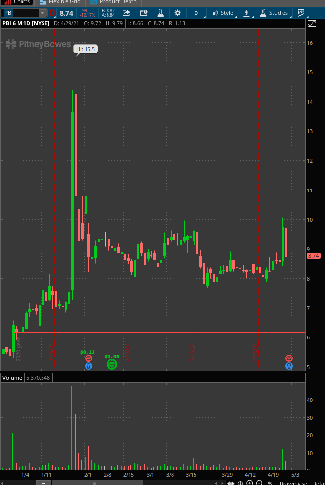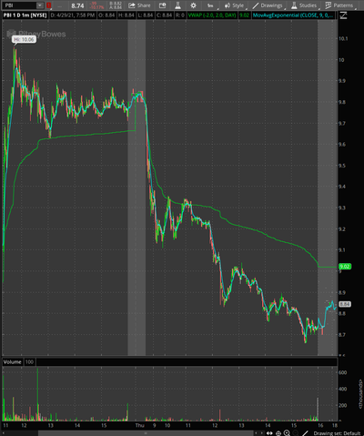 $PBI TRADE- first green day on NYSE Stock- has spiked big before- just never worked out this time- if i'm going to try to trade NYSE stocks going forward i need to take very small size as they don't usually work as well as otc's