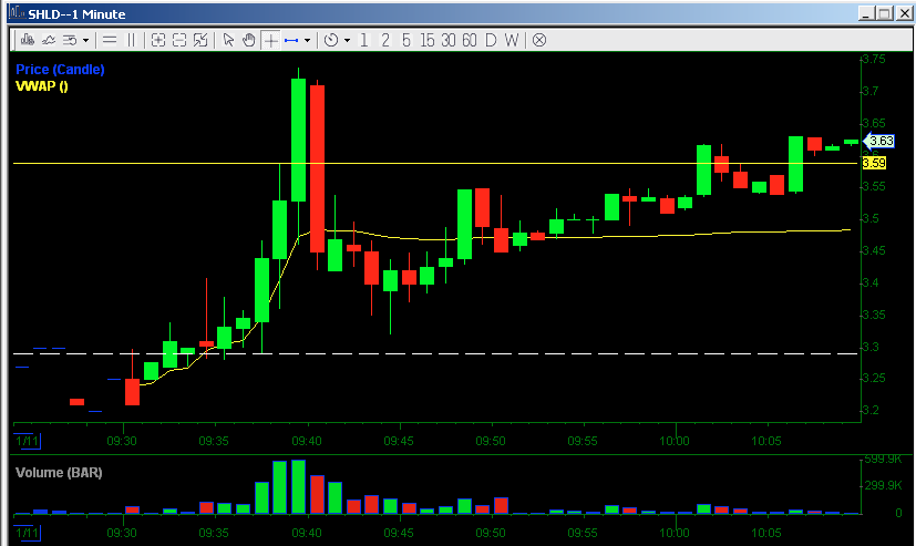 Saw $SHLD spiking up on blockchain news, it pulled back slightly and my thesis was to get in on the break of the previous high at $3.69 with 300 shares (small account), so I prepared my buy order just below at $3.58 and as it moves up I enter, with at least a 15 cent target.