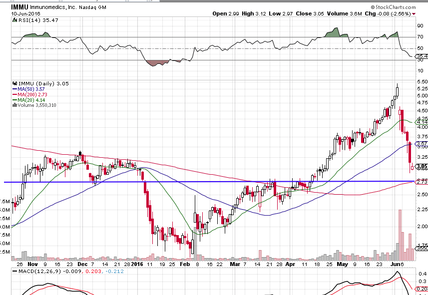 Downtrending searching for a base to ramp up. Based at 3. Waiting for over and under for confirmation of price action at this level, if falls 3 will go down to 2,70 to base (200 moving average and overall support) for next move. Not oversold in the 30 range yet. Will be in play if volume comes in and breaks 3 to the upside.